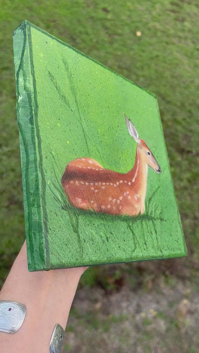 This one is for you… Ever been outside, but on your phone, and you just happen to look up at the right time and see something amazing? I was working, looked up, and saw a fawn and her mom resting in the grass and that’s one of the reasons I painted this little cutie.. to remind us to be present with the natural world. We are a part of it!
