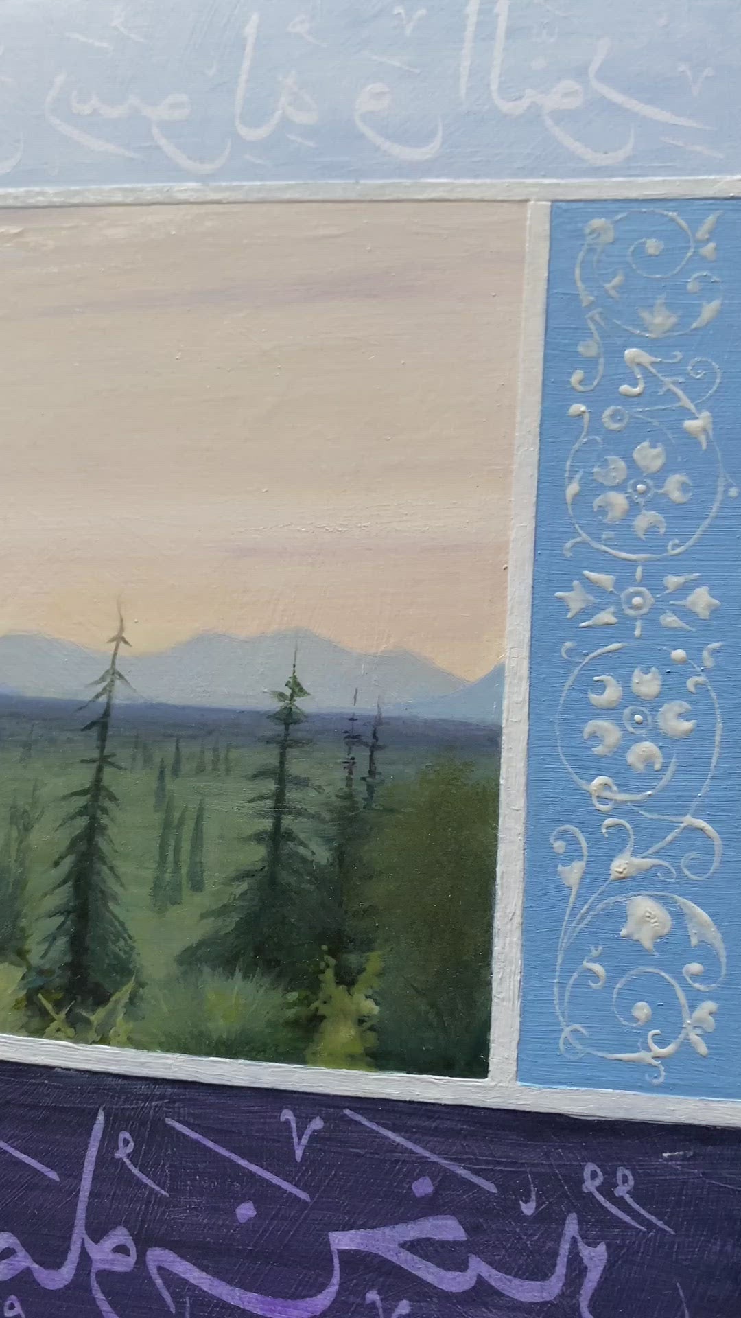 This is an original 9" x 12" oil painting on a wood panel that illustrates a verse from the Quran with a peaceful landscape.