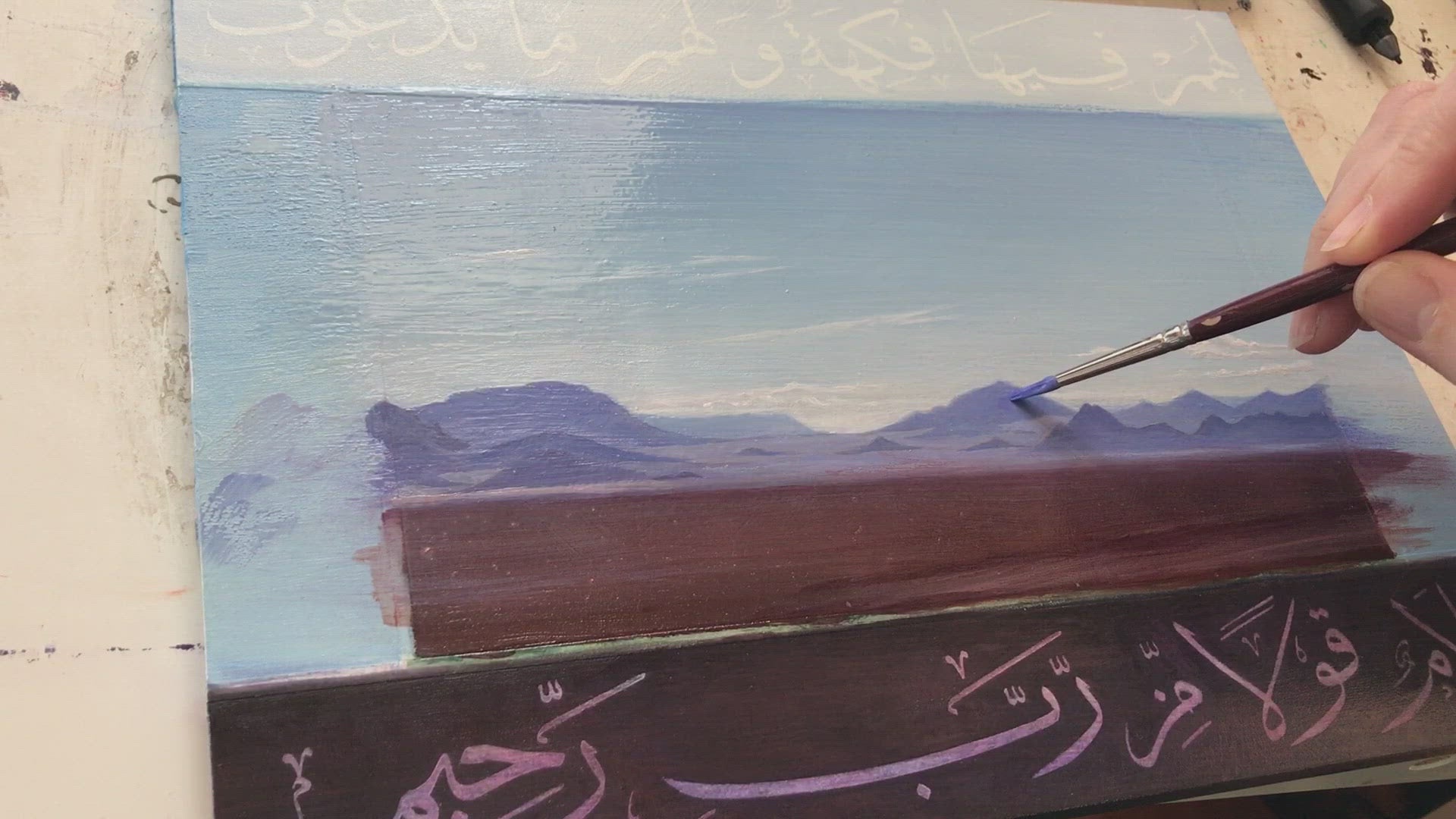 This is a print of the 9" x 12" oil painting on aluminum that illustrates a verse from the Quran with a peaceful landscape framed by pomegranate and grape patterns.