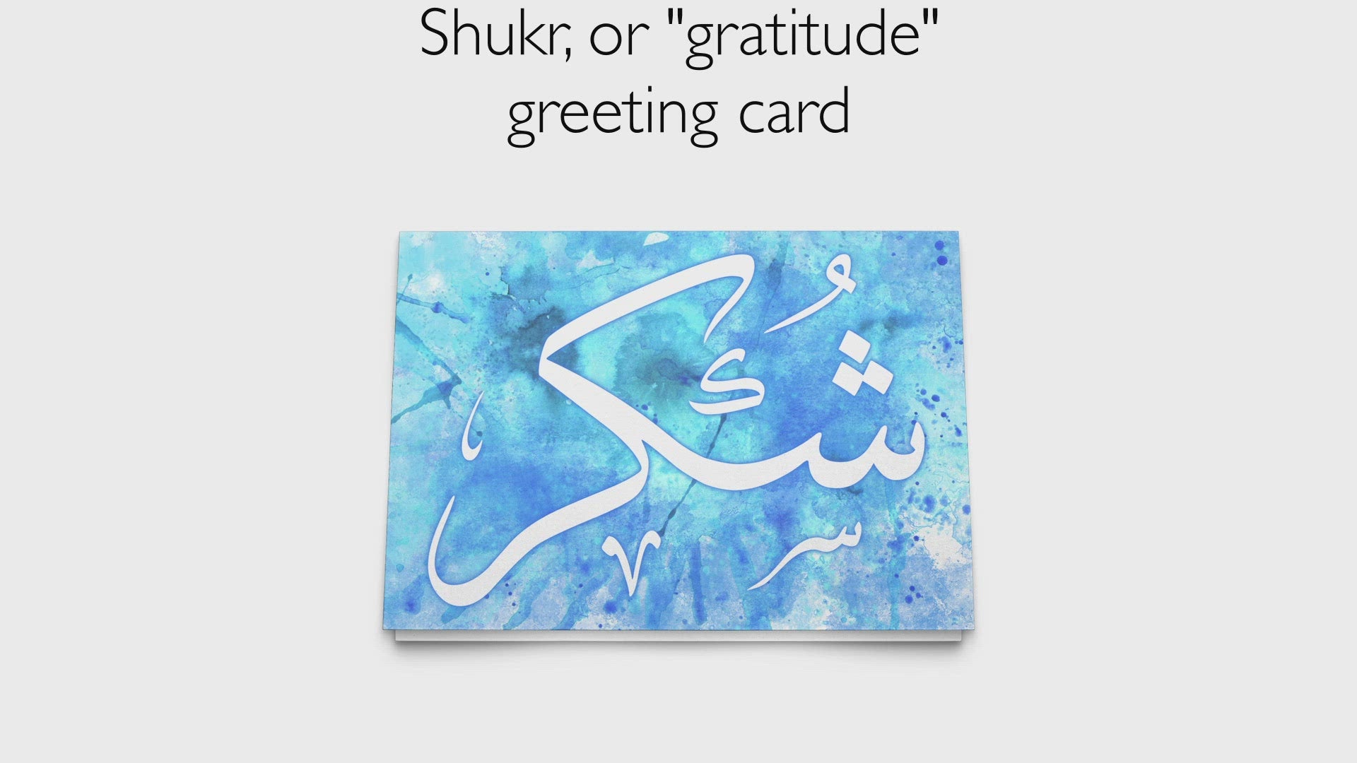 The Arabic calligraphy says شكر which means "gratitude" or "thanks" in Arabic. With crisp, clean lines over a vibrant watercolor background, this makes a great "thank you" card.